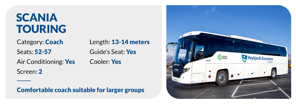 Reykjavík Excursions operates one of Iceland's largest and most modern coach fleets, adhering to the highest safety standards. With approximately 100 vehicles ranging from 7 to 69 seats, we can accommodate groups of all sizes.